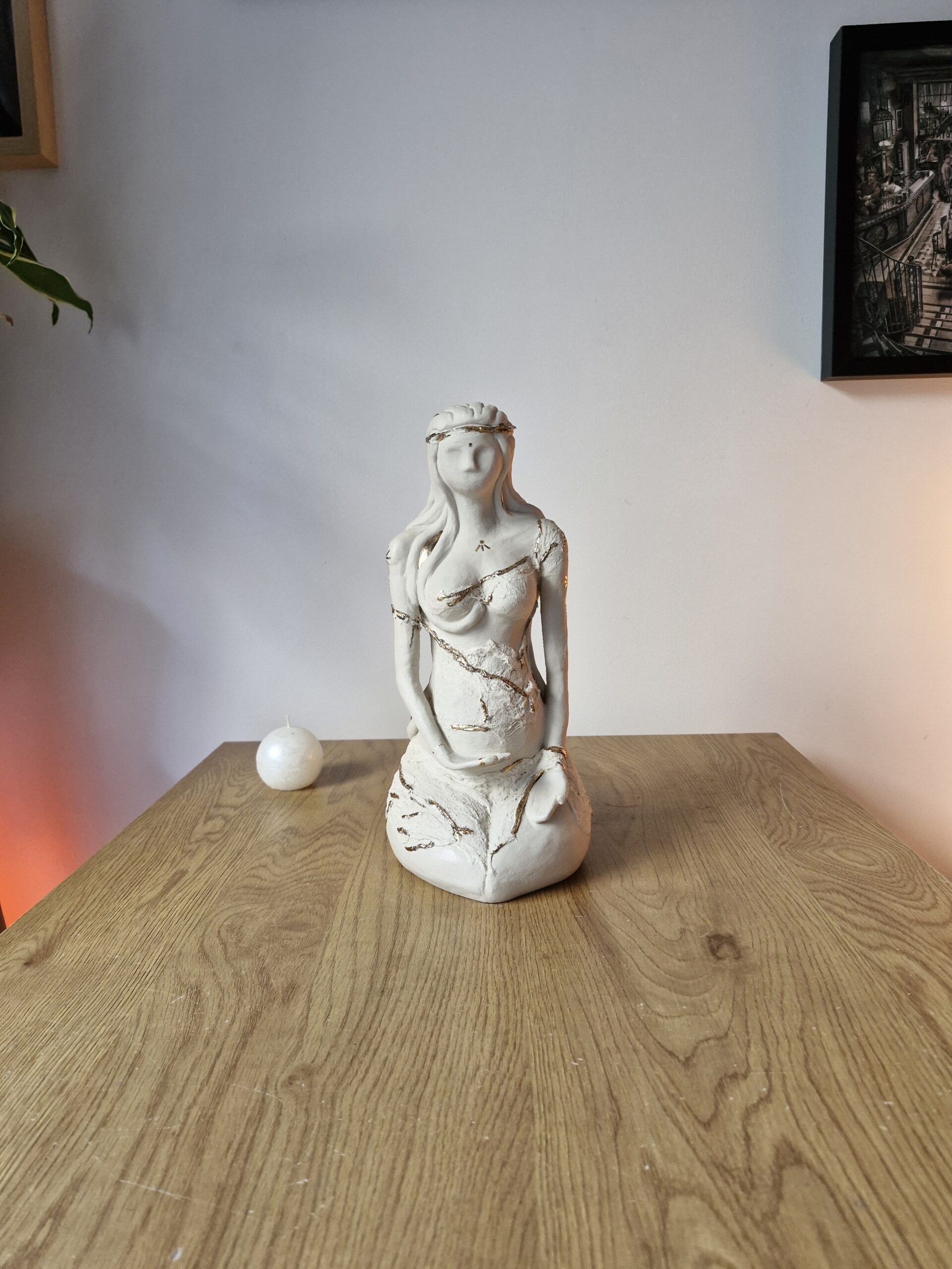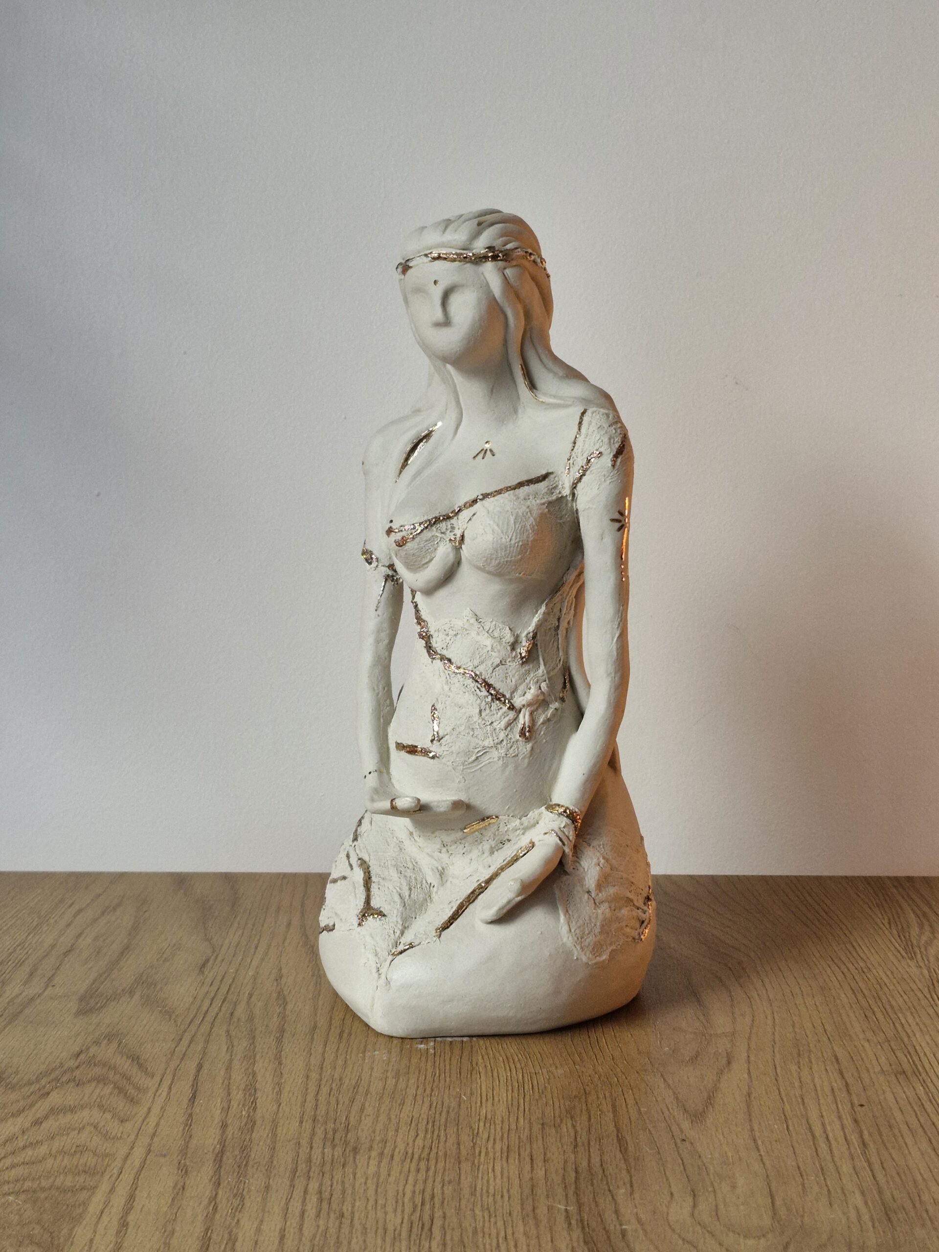 Cette sculpture de femme, profondément reliée au féminin sacré, invite à ralentir, à ressentir, à revenir au cœur de soi. Elle parle de douceur, mais aussi de dignité. De vulnérabilité, mais aussi de force. Elle porte la mémoire du féminin universel : créatrice, guérisseuse, veilleuse de lumière, protectrice du vivant. Sa présence crée immédiatement un espace subtil dans une pièce — un espace qui apaise, qui inspire, qui répare.